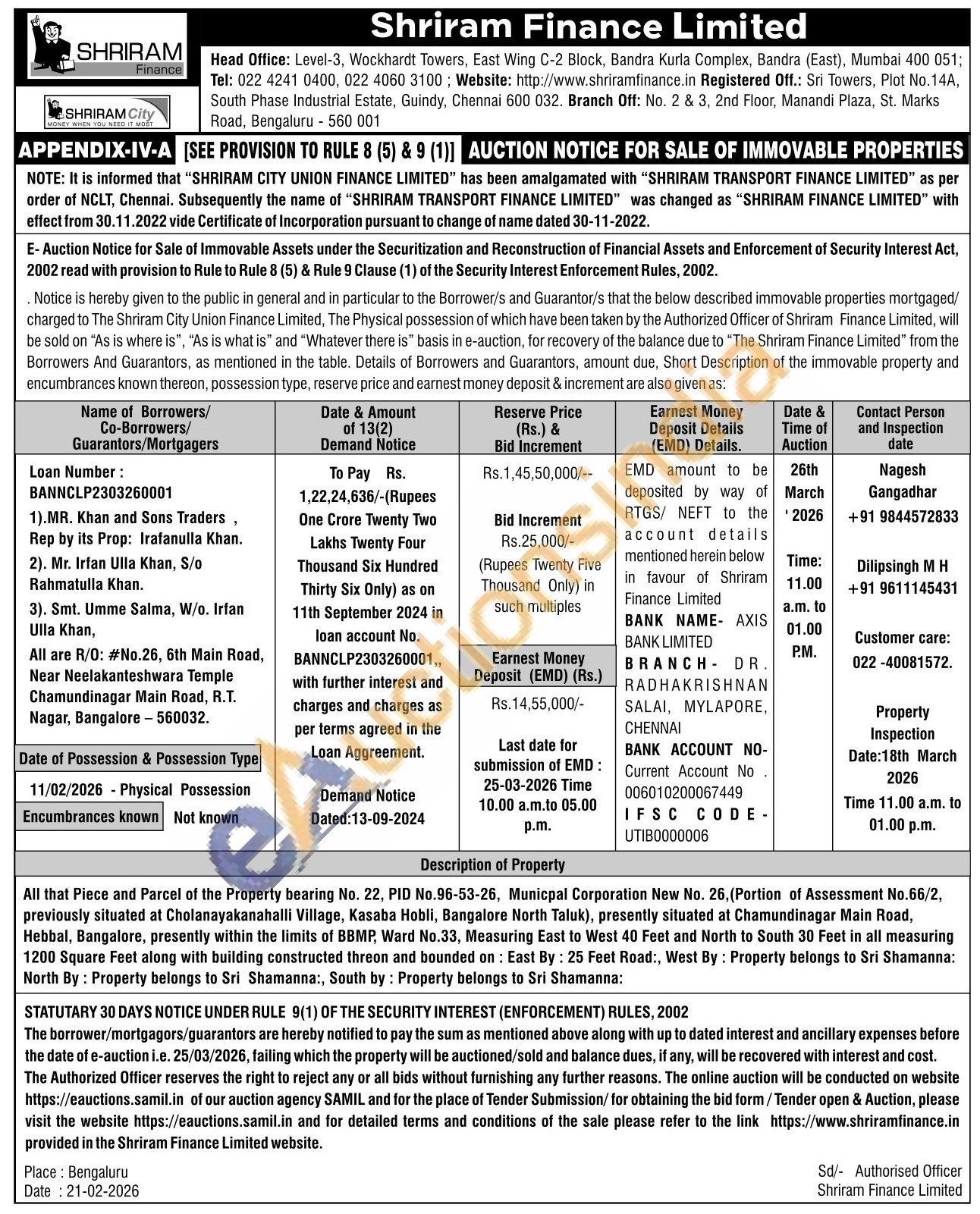 Description of property: All that Piece and Parcel of the Property bearing No. 22, PID No.96-53-26, Municpal Corporation New No. 26, (Portion of Assessment No.66/2, previously situated at Cholanayakanahalli Village, Kasaba Hobli, Bangalore North Taluk), presently situated at Chamundinagar Main Road, Hebbal, Bangalore, presently within the limits of BBMP, Ward No.33, Measuring East to West 40 Feet and North to South 30 Feet in all measuring 1200 Square Feet along with building constructed threon and bounded on: East By: 25 Feet Road:, West By: Property belongs to Sri Shamanna: North By: Property belongs to Sri Shamanna:, South by: Property belongs to Sri Shamanna