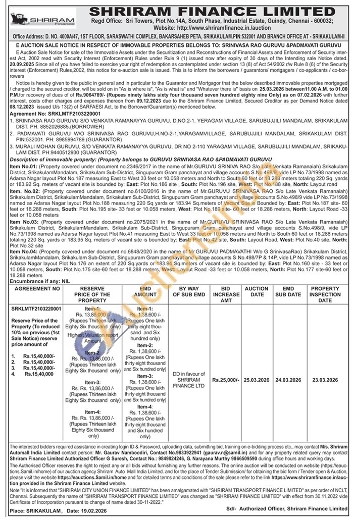 Phone No : 8852026885 / Authorized Officer G Suresh Contact No: 9849824246 / G. Narayana Murthy : 9866509590
