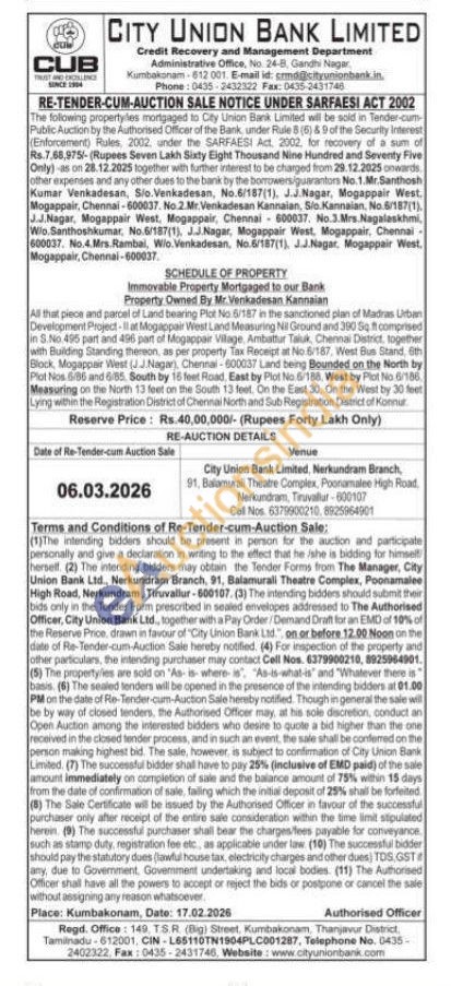 All that piece and parcel of Land bearing Plot No 5/187 in the sanctioned plan of Madras Urban Development Project-il at Mogappair West Land Measuring Nil Ground and 390 Se comprised in S.No.495 part and 496 part of Mogappair Vilage, Ambattur Taluk, Chennai District, together with Building Standing thereon, as per property Tax Receipt at No 6/187, West Bus Stand 6th Block, Mogappair West (J.J.Nagar), Chennai-600037 Land being Bounded on the North by Plot Nos. 6/86 and 685. South by 15 feet Road, East by Plot No 188, West by Plot No 6/188 Measuring on the North 13 feet on the South 13 feet. On the East 30. On the West by 30 feet Lying within the Registration District of Chennal North and Sub Registration District of Konnur