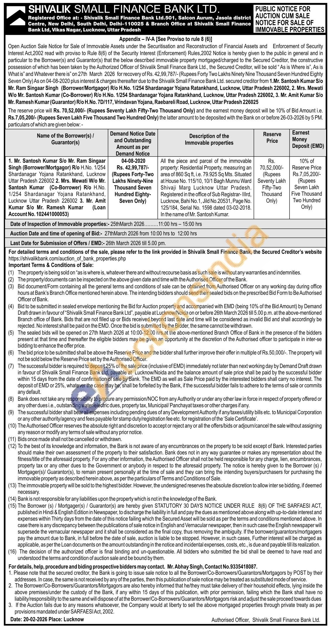 All the piece and parcel of the immovable property: Residential Property, measuring an area of 860 Sq ft, i.e. 79.925 Sq Mts. Situated at House No. 115/10, 10/1 Bagh Munnu Ward Shivaji Marg Lucknow Uttar Pradesh. Registered in the office of Sub Registrar-IIIrd, Lucknow, Bahi No. 1, Jild No.20531, Page No. 125/184, Serial No. 1598 dated 03-02-2018. In the name of Mr. Santosh Kumar
