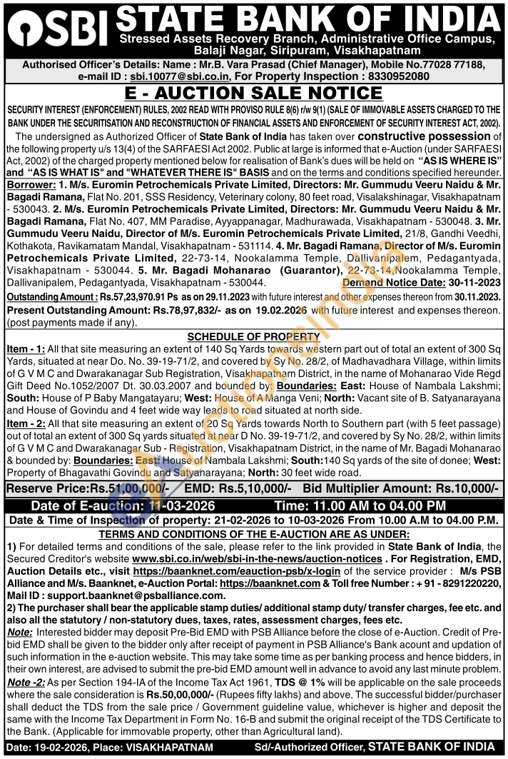 SCHEDULE OF PROPERTY : Item-1: All that site measuring an extent of 140 Sq Yards towards western part out of total an extent of 300 Sq Yards, situated at near Do. No. 39-19-71/2, and covered by Sy No. 28/2, of Madhavadhara Village, within limits of G V M C and Dwarakanagar Sub Registration, Visakhapatnam District, in the name of Mohanarao Vide Regd Gift Deed No. 1052/2007 Dt. 30.03.2007 and bounded by: Boundaries: East: House of Nambala Lakshmi; South: House of P Baby Mangatayaru; West: House of A Manga Veni; North: Vacant site of B. Satyanarayana and House of Govindu and 4 feet wide way leads to road situated at north side.