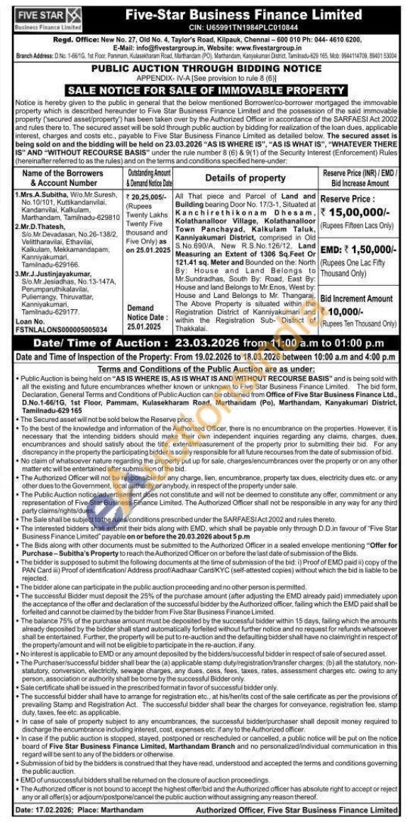 All That piece and Parcel of Land and Building bearing Door No. 17/3-1, Situated at Kanchirethikonam Dhesam, Kolathanalioor Village, Kolathanalioor Town Panchayad, Kalkulam Taluk, Kanyakumari District, comprised in Old No0/A New RS No 126/12 690/A New R.S.No. 126/12, Land Measuring an Extent of 1306 Sq. Feet Or 121.41 sq. Meter and Bounded on the: North By: House and Land Belongs to Mr.Sundradhas, South By: Road, East By: House and land Belongs to Mr Enos, West by: House and Land Belongs to Mr. Thangaraj. The Above Property is situated within the Registration District of Kanniyakumari and within the Registration Sub District of Thakkalai