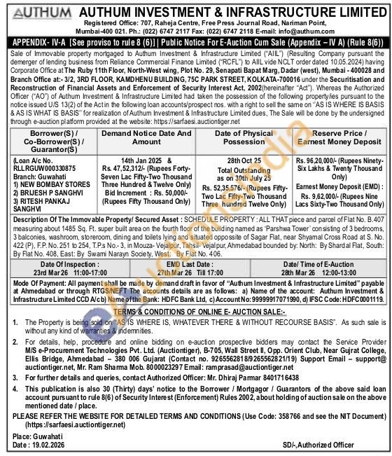Description Of The Immovable Property/ Secured Asset: SCHEDULE PROPERTY: ALL THAT piece and parcel of Flat No. B.407 measuring about 1485 Sq. Ft. super built area on the fourth floor of the building named as 'Parshwa Tower' consisting of 3 bedrooms, 3 balconies, washroom, storeroom, dining and toilets lying and situated oppossite of Sagar Flat, near Shyamal Cross Road at S. No. 422 (P), F.P. No. 251 to 254, T.P.s No.-3, in Mouza- Vejalpur, Tahsil- Vejal pur, Ahmedabad bounded by: North: By Shardal Flat, South: By Flat No. 408, East: By Swami Narayn Society, West: By Flat No. 406.