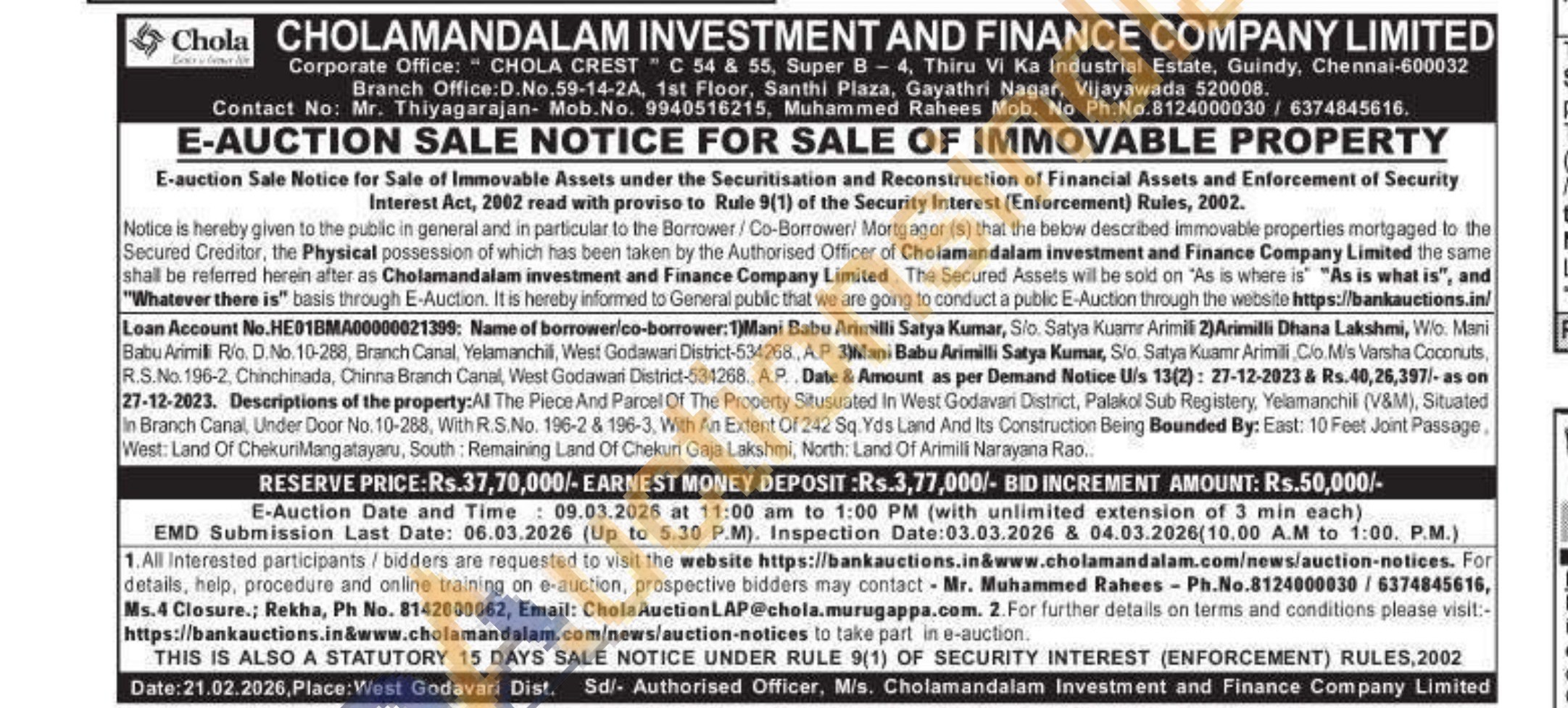 Descriptions of the property:All The Piece And Parcel Of The Property Situated in West Godavari District, Palakol Sub Registery, Yelamanchill (V&M), Situated In Branch Canal, Under Door No. 10-288, With R.S.No. 196-2 & 196-3, With An Extent Of 242 Sq. Yds Land And Its Construction Being Bounded By: East: 10 Feet Joint Passage, West: Land Of Chekuri Mang atayaru, South: Remaining Land Of Chekuri Gaja Lakshmi, North: Land Of Arimili Narayana Rao..