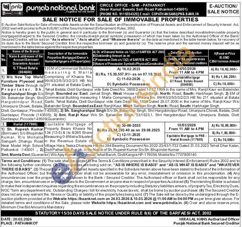 1) EM of Commercial Building measuring 6 Marla Comprising of Khasra No. 99//63/2/5/3/3/2/2/3 HB No 211 situated at Batala Garbi, Tehsil Batala, Distt Gurdaspur vide Sale Deed No. 3608 Dated 10.12.1999 in the name of Mrs. Ranjit Kaur wo Balwinder Singh. Bounded as: East: Jamail Singh, West: House of Surjt Singh, North: Road, South: Harbhajan Singh, 2) EM of Commercial Building measuring 1 Marla Comprising of Khasra No. 99//63/2/5/3/3/2/2/3 HB No 211 situated at Batala Garbi, Tehsil Batala, Distt Gurdaspur vide Sale Deed No. 1838 Dated 25.07.2000 in the name of Mrs. Ranjit Kaur W/o Balwinder Singh. Bounded as East: Ranjit Kaur, West: Sarwan Singh, North: Road, South: Harbhajan Singh