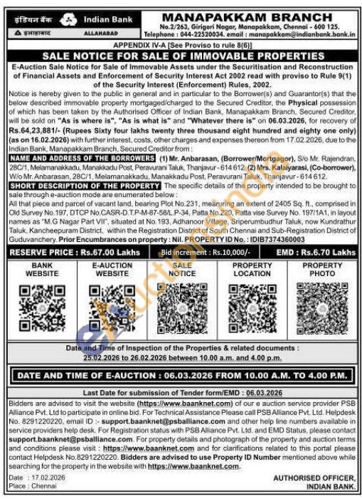 All that piece and parcel of vacant land, bearing Plot No.231, mearuring an extent of 2405 Sq. ft., comprised in Old Survey No. 197, DTCP No.CASR-D.T.P-M-87-58/LP-34, Patta No.220, Patta vise Survey No. 197/1A1, in layout names as "M.G Nagar Part VII, situated at No. 193, Adhanoor Village, Sriperumbudhur Taluk, now Kundrathur Taluk, Kancheepuram District, within the Registration District of South Chennai and Sub-Registration District of Guduvanchery. Prior Encumbrances on property: Nil. PROPERTY ID No.: IDIB7374360003