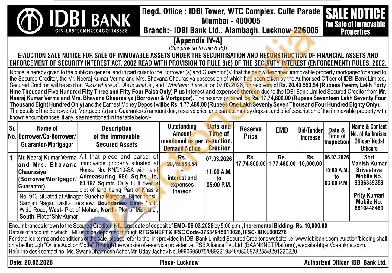 All that piece and parcel of immovable property situated at House No. KN/913-SA with land Admeasuring 680 Sq.fts. ie 63.197 Sq.mtr. Only built over plot of land being Part of Khasra No. 913 situated at Alinagar Sunehra Pargana- Bijnor Tehsil-Sarojini Nagar, Distt. Lucknow. Boundaries- East- 15 ft. Wide Road, West- Plot of Mohan, North- Plot of Mishra Ji, South-Plot of Shiv Kumar