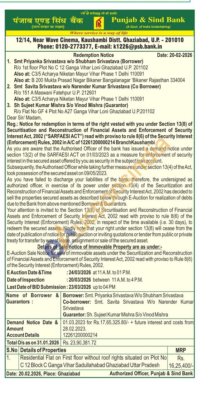 Residential Flat on First floor without roof rights situated on Plot No C 12 Block C Ganga Vihar Sadullahabad Ghaziabad Uttar Pradesh