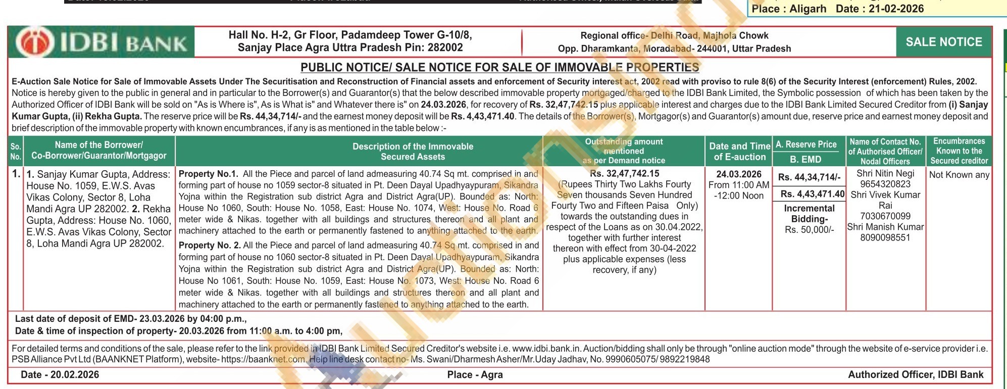 Property No.1. All the Piece and parcel of land admeasuring 40.74 Sq mt. comprised in and forming part of house no 1059 sector-8 situated in Pt. Deen Dayal Upadhyaypuram, Sikandra Yojna within the Registration sub district Agra and District Agra (UP), Bounded as: North: House No 1060, South: House No. 1058, East: House No. 1074, West: House No. Road 6 meter wide & Nikas, together with all buildings and structures thereon and all plant and machinery attached to the earth or permanently fastened to anything attached to the earth, Property No. 2. All the Piece and parcel of land admeasuring 40.74 So mt. comprised in and forming part of house no 1060 sector-8 situated in Pt. Deen Dayal Upadhyaypuram, Sikandra Yojna within the Registration sub district Agra and District Agra(UP), Bounded as: North: House No 1061, South House No. 1059, East House No. 1073, West House No. Road 6 meler wide & Nikas, together with all buildings and structures thereon and all plant and machinery attached to the earth or permanently fastened to anything attached to the earth.