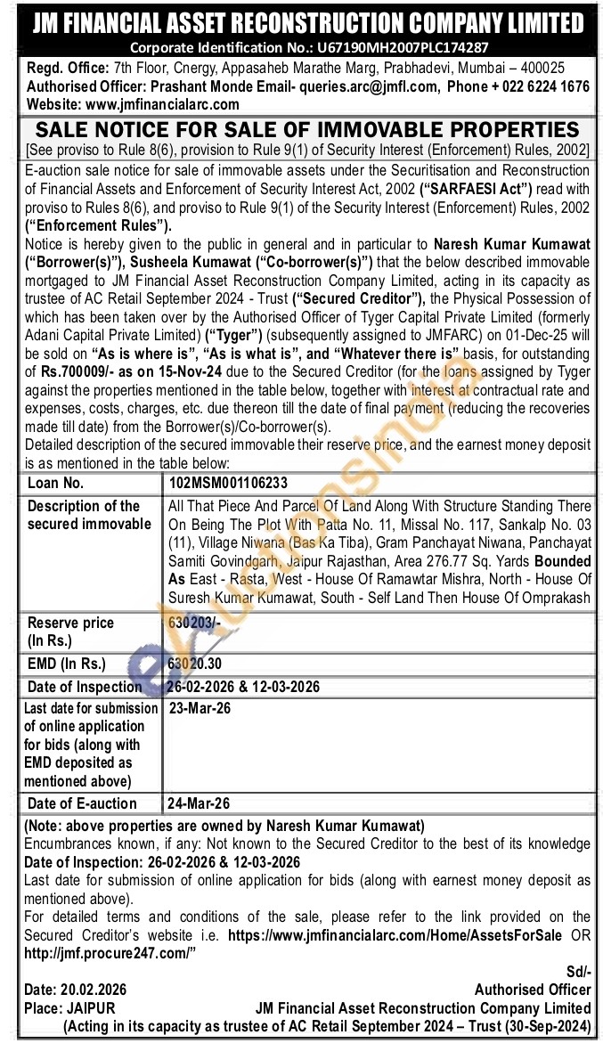 All That Piece And Parcel Of Land Along With Structure Standing There On Being The Plot With Patta No. 11, Missal No. 117, Sankalp No. 03 (11), Village Niwana (Bas Ka Tiba), Gram Panchayat Niwana, Panchayat Samiti Govindgarh, Jaipur Rajasthan, Area 276.77 Sq. Yards Bounded As East Rasta, West House Of Ramawtar Mishra, North House Of Suresh Kumar Kumawat, South- Self Land Then House Of Omprakash