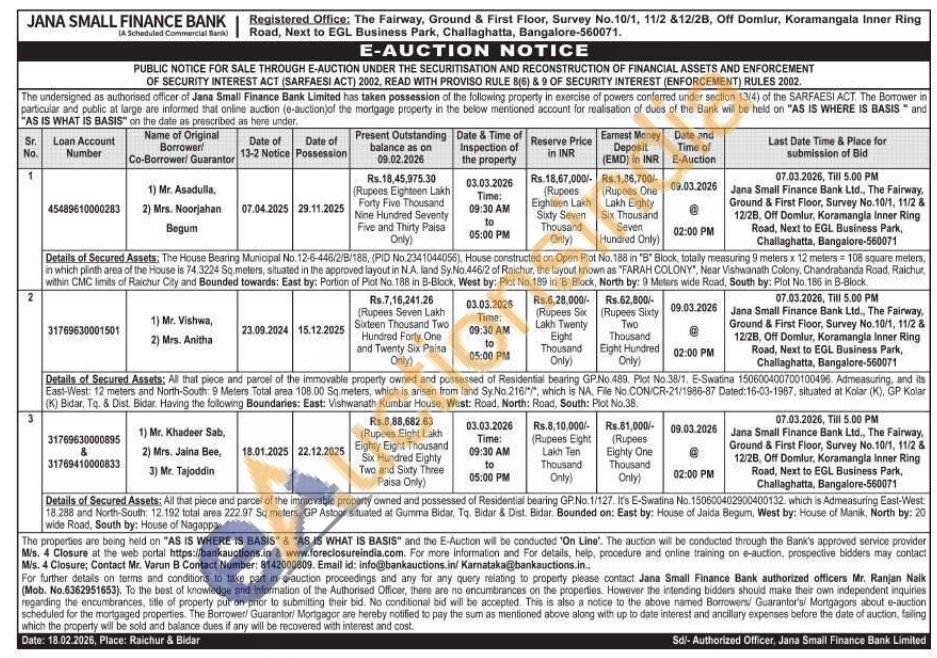 Details of Secured Assets: The House Bearing Municipal No. 12-6-446/2/8/188, (PID No.2341044056), House constructed on Open Plot No. 188 in "B" Block, totally measuring 9 meters x 12 meters = 108 square meters, in which plinth area of the House is 74,3224 Sq meters, situated in the approved layout in N.A. land Sy.No.446/2 of Raichur, the layout known as "FARAH COLONY, Near Vishwanath Colony, Chandrabanda Road, Raichur within CMC limills of Raichur City and Bounded towards: East by: Portion of Piat No. 188 in B-Block, West by: Plot No. 189 in 'B' Block, North by: 9 Meters wide Road, South by: Plot No. 186 in B-Block.