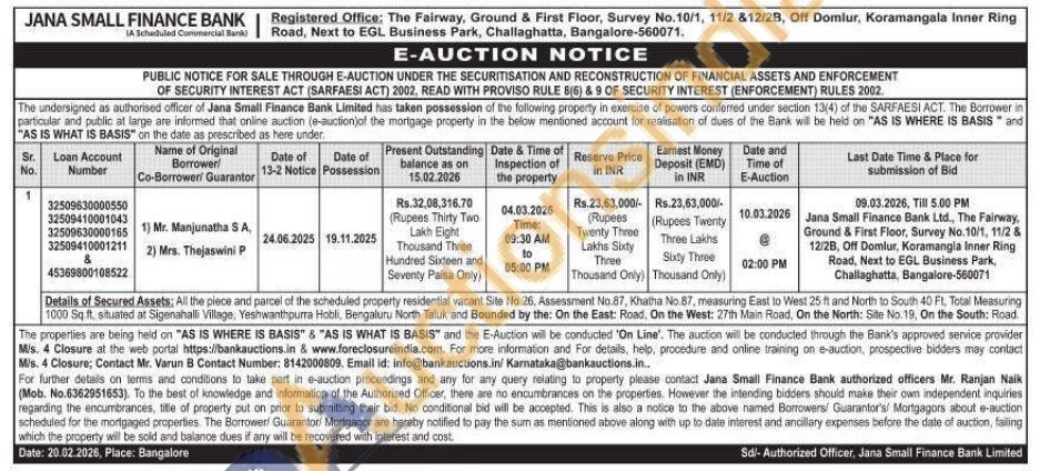 Details of Secured Assets: All the piece and parcel of the scheduled property residential vacant Site No.26. Assessment No.87, Khatha No 87, measuring East to West 25 ft and North to South 40 Ft. Total Measuring 1000 Sq.ft. situated at Sigenahalli Village, Yeshwanthpurra Hobli. Bengaluru North Taluk and Bounded by the: On the East: Road, On the West: 27th Main Road, On the North: Site No. 19, On the South: Road