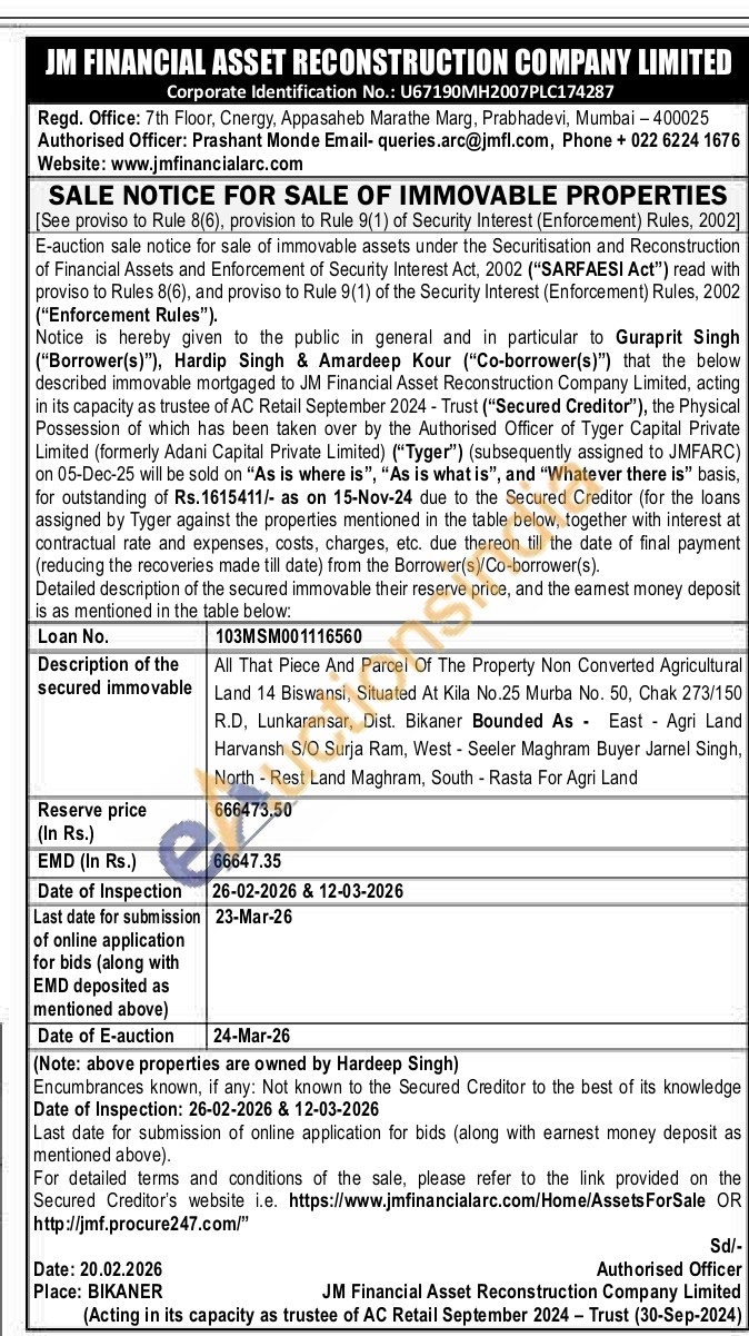 All That Piece And Parcel Of The Property Non Converted Agricultural Land 14 Biswansi, Situated At Kila No.25 Murba No. 50, Chak 273/150 R.D, Lunkaransar, Dist. Bikaner Bounded As East Agri Land Harvansh S/O Surja Ram, West - Seeler Maghram Buyer Jarnel Singh, North - Rest Land Maghram, South - Rasta For Agri Land