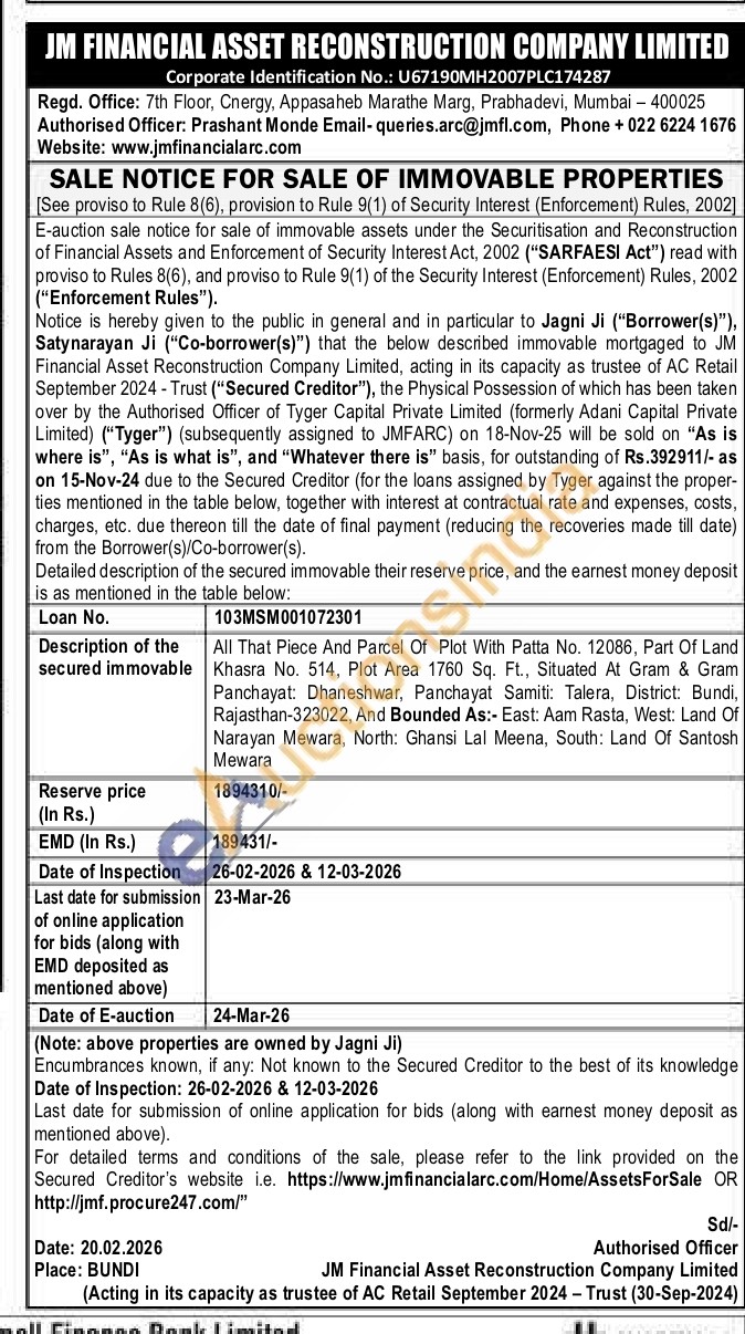 All That Piece And Parcel Of Plot With Patta No. 12086, Part Of Land Khasra No. 514, Plot Area 1760 Sq. Ft., Situated At Gram & Gram Panchayat: Dhaneshwar, Panchayat Samiti: Talera, District: Bundi, Rajasthan-323022, And Bounded As:- East: Aam Rasta, West: Land Of Narayan Mewara, North: Ghansi Lal Meena, South: Land Of Santosh Mewara