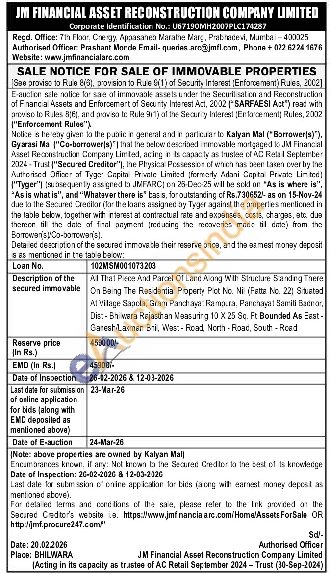 All That Piece And Parcel Of Land Along With Structure Standing There On Being The Residential Property Plot No. Nil (Patta No. 22) Situated At Village Sapola, Gram Panchayat Rampura, Panchayat Samiti Badnor, Dist-Bhilwara Rajasthan Measuring 10 X 25 Sq. Ft Bounded As East -Ganesh/Laxman Bhil, West Road, North Road, South - Road