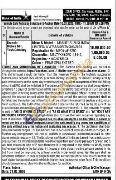 Make & Model:- MARUTI SUZUKI INDIA LIMITED/GVITARA DELTA CNG/2025 Registration No:-MP09-AF-8290 ChassisNo: MBJTYKK1SRC118443, Engine No:-K15CN7383031 Colour: PRME OPULENT RED
