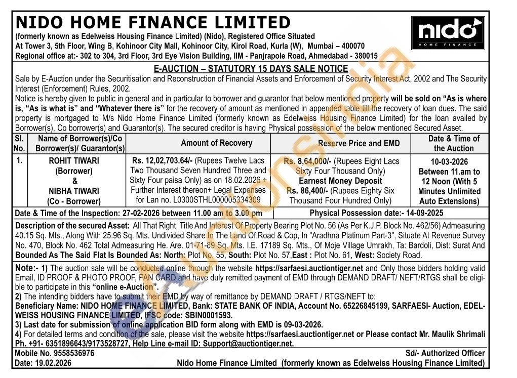 All That Right, Title And Interest Of Property Bearing Plot No. 56 (As Per K.J.P. Block No. 462/56) Admeasuring 40.15 Sq. Mts., Along With 25.96 Sq. Mts. Undivided Share In The Land Of Road & Cop, In "Aradhna Platinum Part-3", Situate At Revenue Survey No. 470, Block No. 462 Total Admeasuring He. Are. 01-71-89 Sq. Mts. I.E. 17189 Sq. Mts., Of Moje Village Umrakh, Ta: Bardoli, Dist: Surat And Bounded As The Said Flat Is Bounded As: North: Plot No. 55, South: Plot No. 57, East: Plot No. 61, West: Society Road