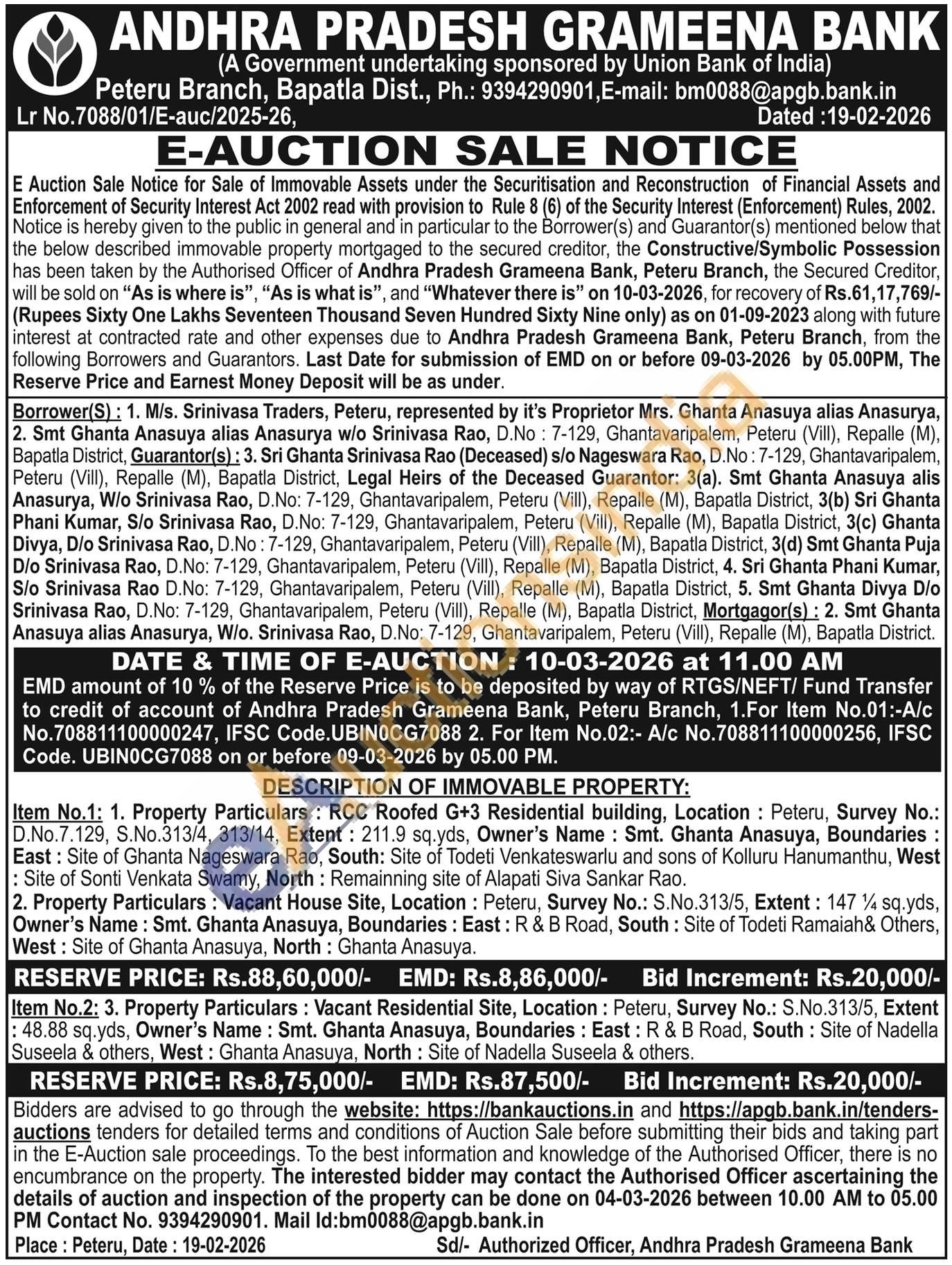 Item No.2: 3. Property Particulars: Vacant Residential Site, Location: Peteru, Survey No.: S.No.313/5, Extent :48.88 sq.yds, Owner's Name: Smt. Ghanta Anasuya, Boundaries: East: R & B Road, South: Site of Nadella Suseela & others, West: Ghanta Anasuya, North: Site of Nadella Suseela & others.
