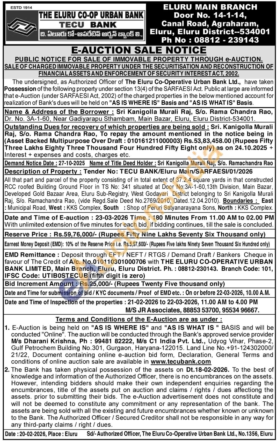 All that part and parcel of the property consisting of in total extent of 37.2.4 square yards in that constructed RCC roofed Building Ground Floor in TS No: 341 situated at Door No:3A-1-60, 13th Division, Main Bazar, Developed Gold Bazaar Area, Eluru Sub-Registry, West Godavari District belonging to Sri Kanigolla Murali Raj, S/o. Ramachandra Rao, (vide Regd. Sale Deed No.2769/2010, Dated. 12.04.2010). Boundaries: East : Municipal Road, West: KKS Complex, South Shop of Peruri Satyanarayana Sons, North: KKS Complex.