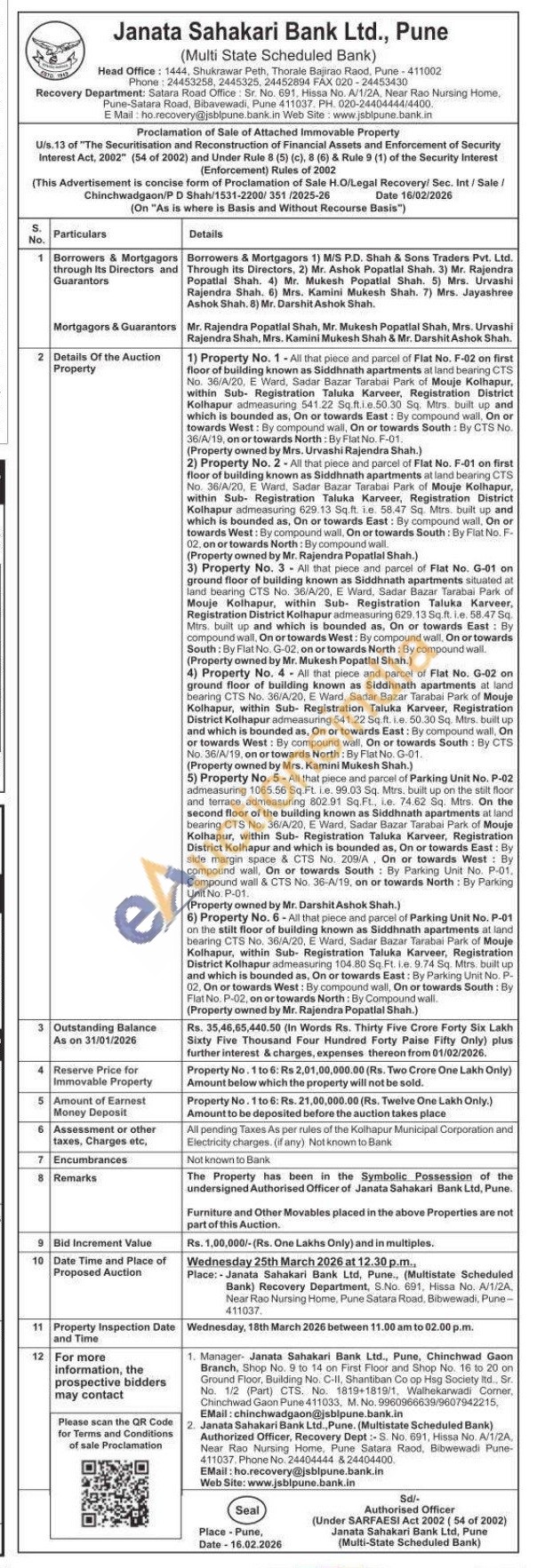 4) Property No. 4 All that piece and parcel of Flat No. G-02 on ground floor of building known as Siddhnath apartments at land bearing CTS No. 36/A/20, E Ward, Sadar Bazar Tarabai Park of Mouje Kolhapur, within Sub- Registration Taluka Karveer, Registration District Kolhapur admeasuring 541.22 Sq ft. i.e. 50.30 Sq. Mirs, built up and which is bounded as, On or towards East: By compound wall, On or towards West: By compound wall, On or towards South: By CTS No. 36/A/19, on or towards North: By Flat No. G-01.