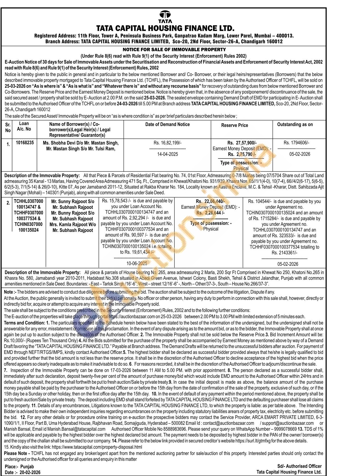 Description of the Immovable Property: All that Piece & Parcels of Residential Flat bearing No. 74, 01st Floor, Admeasuring 0-7/8 Marlas being 07/5704 Share out of Total Land admeasuring 35 Kanal-13 Marlas, Having Covered Area Admeasuring 471 Sq. Ft., Comprised in Khewat/Khatoni No. 931/939, Khasra Nos. 65//1/1(4-0), 10(7-4), 66//4/2(6-17),5(6-5), 6/2(5-3), 7/1(5-14) & 26(0-10), Kitte 07, As per Jamabandi 2011-12, Situated at Rakba Kharar No. 184, Locality known as Aastha Enclave, M.C. & Tehsil -Kharar, Distt. Sahibzada Ajit Singh Nagar (Mohali)-140301 (Punjab), along with all common amenities under Sale Deed.