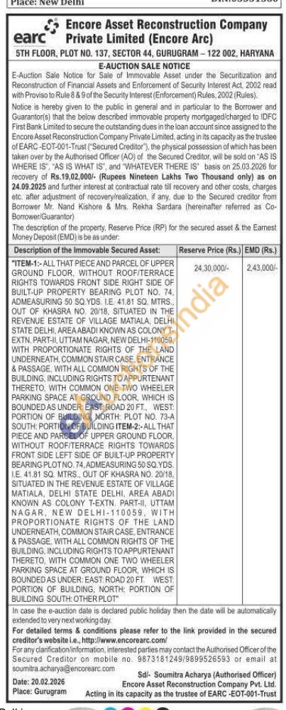 "ITEM-1:-ALL THAT PIECE AND PARCEL OF UPPER GROUND FLOOR, WITHOUT ROOF/TERRACE RIGHTS TOWARDS FRONT SIDE RIGHT SIDE OF BUILT-UP PROPERTY BEARING PLOT NO. 74, ADMEASURING 50 SQ.YDS. I.E. 41.81 SQ. MTRS.. OUT OF KHASRA NO. 20/18, SITUATED IN THE REVENUE ESTATE OF VILLAGE MATIALA, DELHI STATE DELHI, AREA ABADI KNOWN AS COLONY T-EXTN. PART-II, UTTAM NAGAR, NEW DELHI-110059, WITH PROPORTIONATE RIGHTS OF THE LAND UNDERNEATH, COMMON STAIR CASE, ENTRANCE & PASSAGE, WITH ALL COMMON RIGHTS OF THE BUILDING, INCLUDING RIGHTS TO APPURTENANT THERETO, WITH COMMON ONE TWO WHEELER PARKING SPACE AT GROUND FLOOR, WHICH IS BOUNDED AS UNDER: EAST: ROAD 20 FT., WEST PORTION OF BUILDING, NORTH: PLOT NO. 73-A SOUTH: PORTION OF BUILDING ITEM-2:-ALL THAT PIECE AND PARCEL OF UPPER GROUND FLOOR, WITHOUT ROOF/TERRACE RIGHTS TOWARDS FRONT SIDE LEFT SIDE OF BUILT-UP PROPERTY BEARING PLOT NO. 74, ADMEASURING 50 SQ YDS. I.E. 41.81 SQ. MTRS., OUT OF KHASRA NO. 20/18, SITUATED IN THE REVENUE ESTATE OF VILLAGE MATIALA, DELHI STATE DELHI, AREA ABADI KNOWN AS COLONY T-EXTN PART-II, UTTAM NAGAR, NEW DELHI-110059, WITH PROPORTIONATE RIGHTS OF THE LAND UNDERNEATH, COMMON STAIR CASE, ENTRANCE & PASSAGE, WITH ALL COMMON RIGHTS OF THE BUILDING, INCLUDING RIGHTS TO APPURTENANT THERETO, WITH COMMON ONE TWO WHEELER PARKING SPACE AT GROUND FLOOR, WHICH IS BOUNDED AS UNDER: EAST: ROAD 20 FT. WEST PORTION OF BUILDING, NORTH: PORTION OF BUILDING SOUTH: OTHER PLOT"