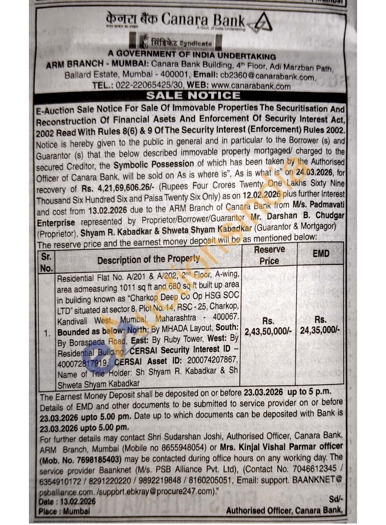 Residential Flat No. A/201 & A/202, 2nd Floor, A-wing, area admeasuring 1011 sq ft and 680 sq ft built up area in building known as "Charkop Deep Co Op HSG SOC LTD" situated at sector 8, Plot No. 14, RSC-25, Charkop, Kandivali West, Mumbai, Maharashtra 400067. Bounded as below: North: By MHADA Layout, South: By Boraspada Road, East: By Ruby Tower, West: By Residential Building, CERSAI Security Interest ID -400072817919, CERSAI Asset ID: 200074207867, Name of Title Holder: Sh Shyam R. Kabadkar & Sh Shweta Shyam Kabadkar