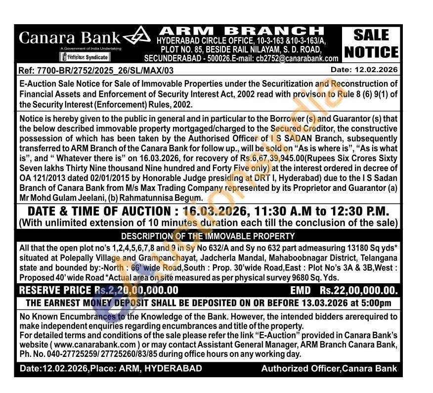 All that the open plot no's 1,2,4,5,6,7,8 and 9 in Sy No 632/A and Sy no 632 part admeasuring 13180 Sq yds* situated at Polepally Village and Grampanchayat, Jadcherla Mandal, Mahaboobnagar District, Telangana state and bounded by:-North: 66' wide Road, South: Prop. 30'wide Road, East: Plot No's 3A & 3B, West: Proposed 40' wide Road *Actual area on site measured as per physical survey 9680 Sq. Yds