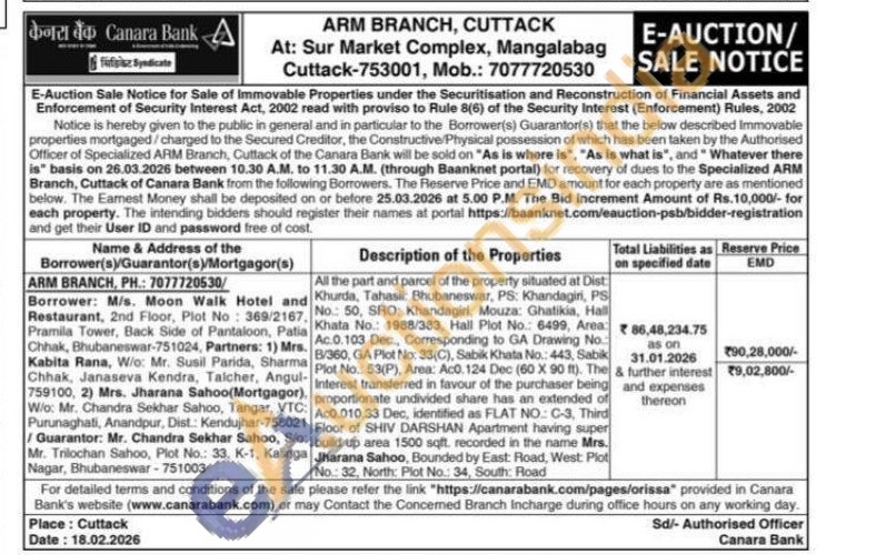 All the part and parcel of the property situated at Dist: Khurda, Tahasil: Bhubaneswar, PS: Khandagiri, PS No.: 50, SRO: Khandagiri, Mouza: Ghatikia, Hall Khata No.: 1988/383, Hall Plot No.: 6499, Area: Ac.0.103 Dec., Corresponding to GA Drawing No. B/360, GA Plot No: 33(C), Sabik Khata No.: 443, Sabik Plot No.: 53(P), Area: Ac0.124 Dec (60 X 90 ft). The -Interest transferred in favour of the purchaser being , proportionate undivided share has an extended of Ac0.010.33 Dec, identified as FLAT NO: C-3, Third Floor of SHIV DARSHAN Apartment having super build up area 1500 sqft. recorded in the name Mrs. Jharana Sahoo, Bounded by East: Road, West: Plot No.: 32, North: Plot No.: 34, South: Road