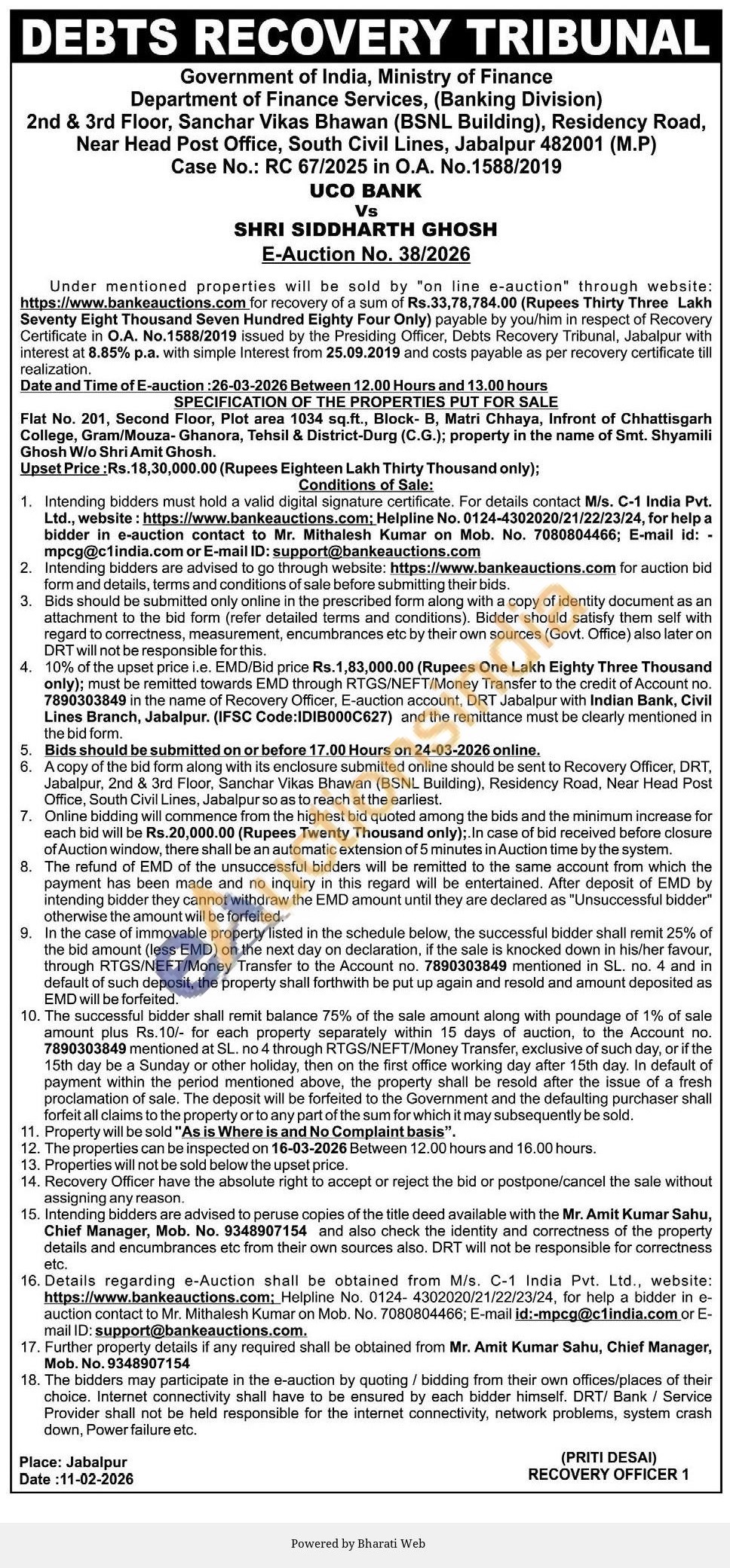 Flat No. 201, Second Floor, Plot area 1034 sq.ft., Block B, Matri Chhaya, Infront of Chhattisgarh College, Gram/Mouza- Ghanora, Tehsil & District-Durg (C.G.); property in the name of Smt. Shyamili Ghosh W/o Shri Amit Ghosh.