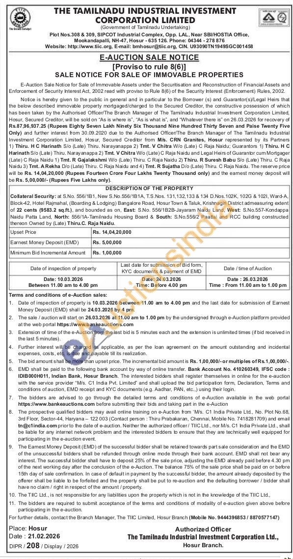 Collateral Security: at S.No. 556/181, New S.No. 556/181A, TS.Nos. 131, 132, 133 & 134 D. Nos 102K, 1026 & 1021, Ward-A, Block-42, Hotel Rajmahal, (Boarding & Lodging) Bangalore Road, Hosur Town & Taluk, Krishnagiri District admeasuring extent of 22 cents (9583.2 sq.ft.), and bounded as on, East: S.No. 556/1B2B-Jayaram Naidu Land, West: S.No.557-Kondappa Naidu Patta Land, North: 556/1A-Tamilnadu Housing Board & South: S No. 556/2 Paattai and RCC building constructed therean Owned by (Late) Thiru.C. Raja Naidu