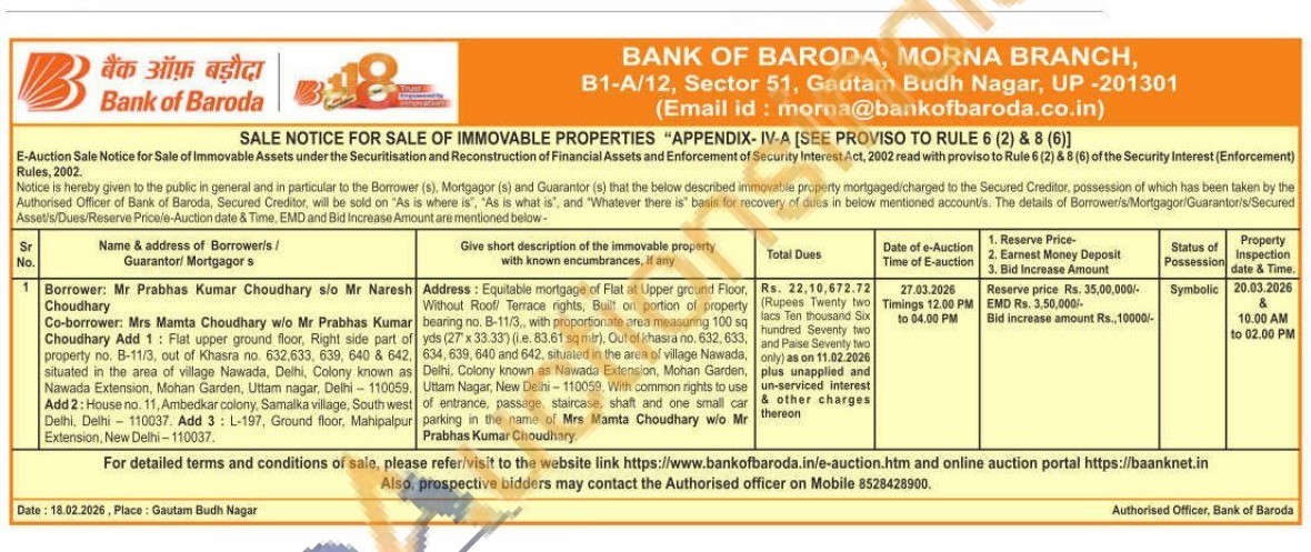 Address: Equitable mortgage of Flat at Upper ground Floor, Without Roof Terrace rights. Built on portion of property bearing no. B-11/3, with proportionate area measuring 100 sq yds (27 x 33.33) (ie. 83.61 sq mtr), Out of khasra no. 632. 633. 634, 639, 640 and 642, situated in the area of village Nawada, Delhi, Colony known as Nawada Extension, Mohan Garden, Uttam Nagar, New Delhi-110059, With common rights to use of entrance, passage, staircase, shaft and one small car parking in the name of Mrs Mamta Choudhary w/o Mr Prabhas Kumar Choudhary.