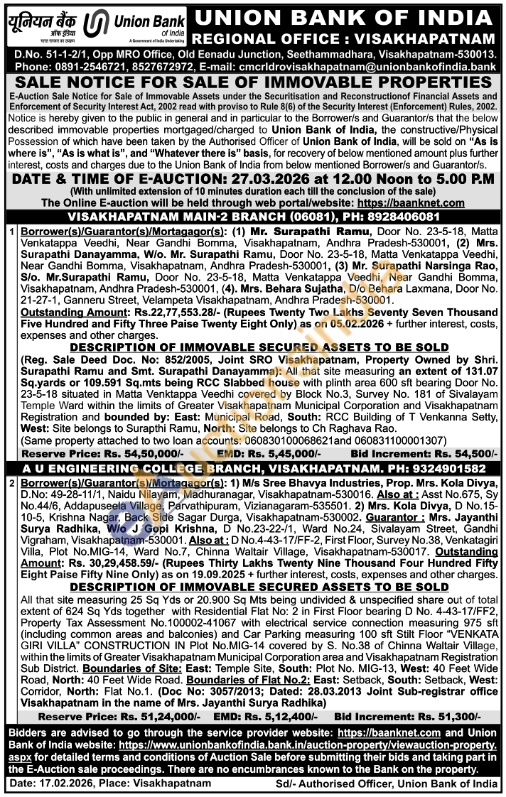 (Reg. Sale Deed Doc. No: 852/2005, Joint SRO Visakhapatnam, Property Owned by Shri. Surapathi Ramu and Smt. Surapathi Danayamma): All that site measuring an extent of 131.07 Sq.yards or 109.591 Sq.mts being RCC Slabbed house with plinth area 600 sft bearing Door No. 23-5-18 situated in Matta Venktappa Veedhi covered by Block No.3, Survey No. 181 of Sivalayam Temple Ward within the limits of Greater Visakhapatnam Municipal Corporation and Visakhapatnam Registration and bounded by: East: Municipal Road, South: RCC Building of T Venkanna Setty, West: Site belongs to Surapthi Ramu, North: Site belongs to Ch Raghava Rao. (Same property attached to two loan accounts: 060830100068621and 060831100001307)