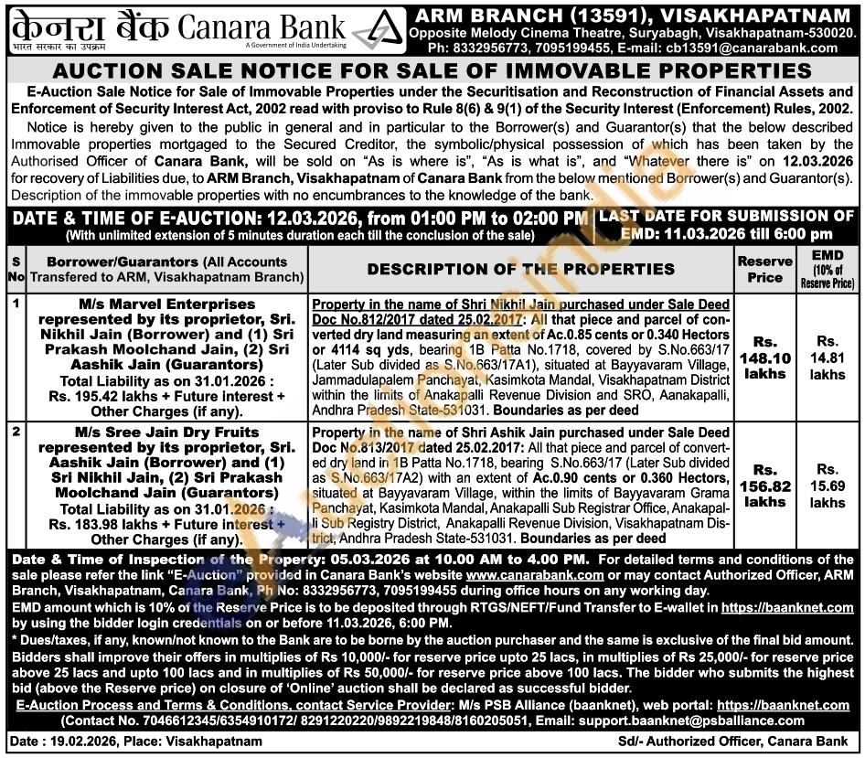 Property in the name of Shri Nikhil Jain purchased under Sale Deed Doc No.812/2017 dated 25.02.2017: All that piece and parcel of con-verted dry land measuring an extent of Ac.0.85 cents or 0.340 Hectors or 4114 sq yds, bearing 1B Patta No.1718, covered by S.No.663/17 (Later Sub divided as S.No.663/17A1), situated at Bayyavaram Village, Jammadulapalem Panchayat, Kasimkota Mandal, Visakhapatnam District within the limits of Anakapalli Revenue Division and SRO, Aanakapalli, Andhra Pradesh State-531031. Boundaries as per deed