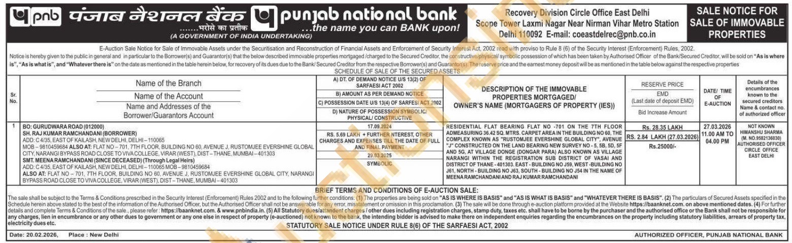 RESIDENTIAL FLAT BEARING FLAT NO -701 ON THE 7TH FLOOR ADMEASURING 36.42 SQ. MTRS. CARPET AREA IN THE BUILDING NO 60, THE COMPLEX KNOWN AS "RUSTOMJEE EVERSHINE GLOBAL CITY", AVENUE "J" CONSTRUCTED ON THE LAND BEARING NEW SURVEY NO-5, 58, 50, 5F AND 5G, AT VILLAGE DONGE (DONGAR PARA) ALSO KNOWN AS VILLAGE NARANGI WITHIN THE REGISTRATION SUB DISTRICT OF VASAI AND DISTRICT OF THANE-401303. EAST-BUILDING NO J59, WEST-BUILDING NO J61, NORTH BUILDING NO J63, SOUTH-BUILDING NO J54 IN THE NAME OF MEENA RAMCHANDANI AND RAJ KUMAR RAMCHANDANI
