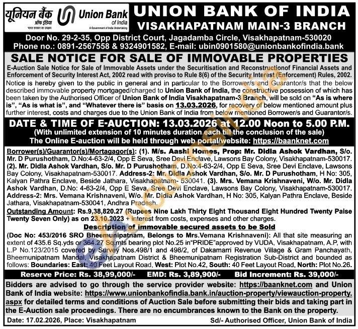 Contact Phone no.: 0891-2567558 & 9324901582, E- mail: ubin0901580@unionbankofindia.bank