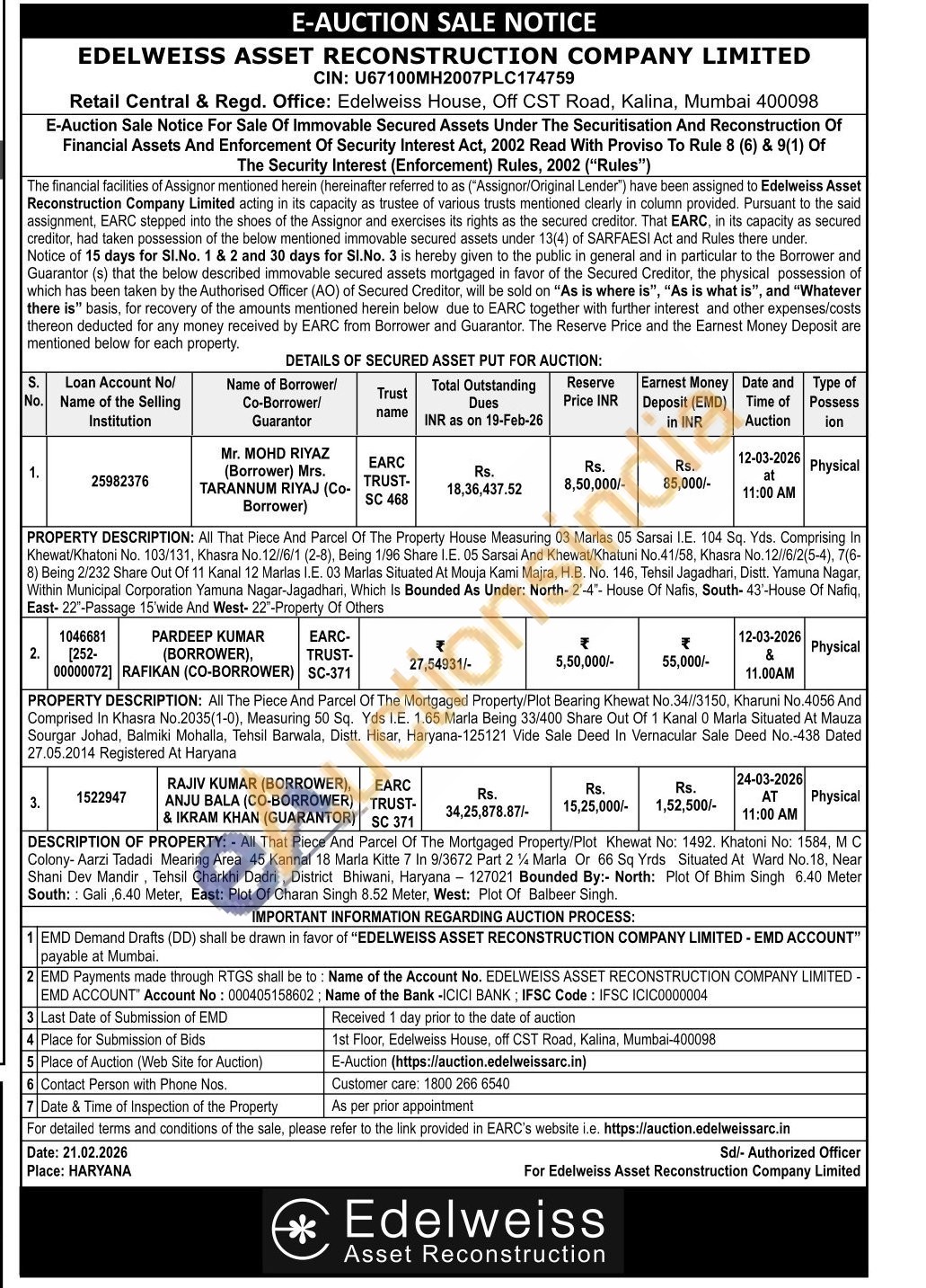PROPERTY DESCRIPTION: All That Piece And Parcel Of The Property House Measuring 03 Marlas 05 Sarsai I.E. 104 Sq. Yds. Comprising In Khewat/Khatoni No. 103/131, Khasra No. 12//6/1 (2-8), Being 1/96 Share I.E. 05 Sarsai And Khewat/Khatuni No.41/58, Khasra No.12//6/2(5-4), 7(6-8) Being 2/232 Share Out Of 11 Kanal 12 Marlas I.E. 03 Marlas Situated At Mouja Kami Majra, H.B. No. 146, Tehsil Jagadhari, Distt. Yamuna Nagar, Within Municipal Corporation Yamuna Nagar-Jagadhari, Which Is Bounded As Under: North-2-4"- House Of Nafis, South-43-House Of Nafiq, East-22-Passage 15'wide And West- 22-Property Of Others