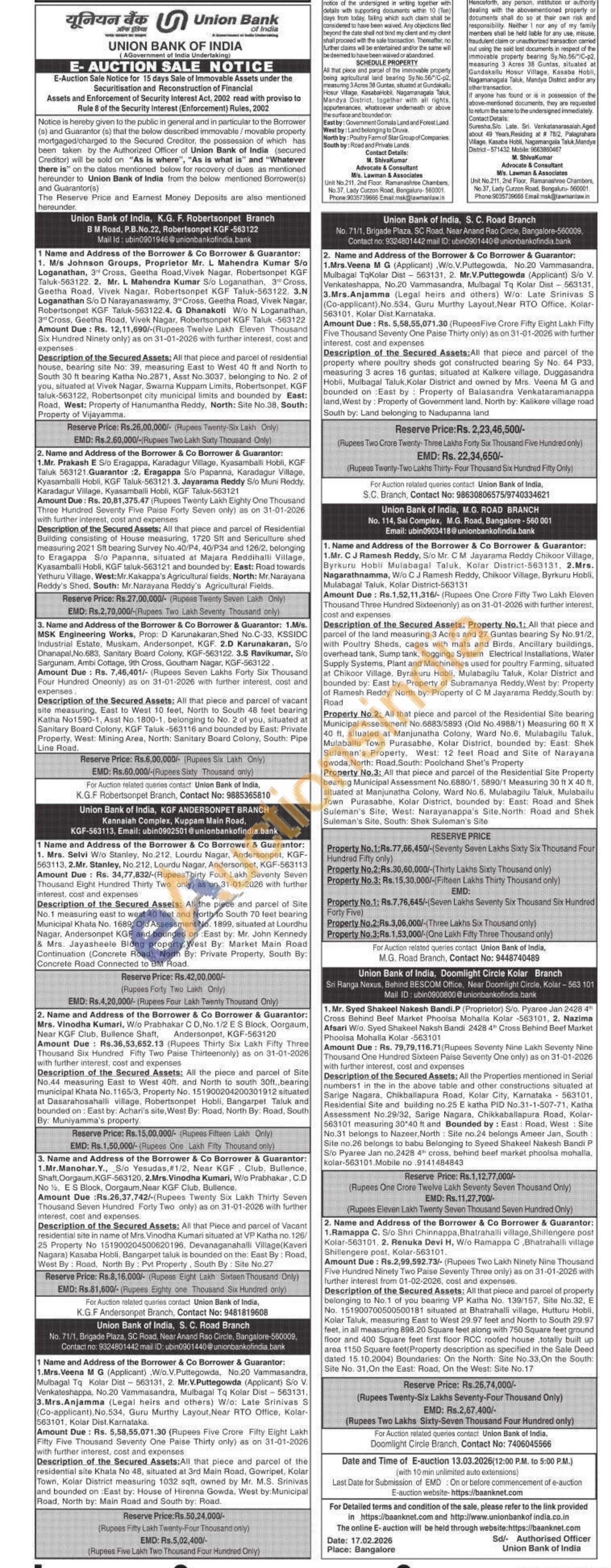 Property No.1: All that piece and parcel of the land measuring 3 Acres and 27 Guntas bearing Sy No.91/2, with Poultry Sheds, cages with mats and Birds, Ancillary buildings, overhead tank, Sump tank, floggings System Electrical Installations, Water Supply Systems, Plant and Machineries used for poultry Farming, situated at Chikoor Village, Byrakuru Hobli, Mulabagilu Taluk, Kolar District and bounded by: East by: Property of Subramanya Reddy, West by: Property of Ramesh Reddy, North by: Property of C M Jayarama Reddy, South by: Road