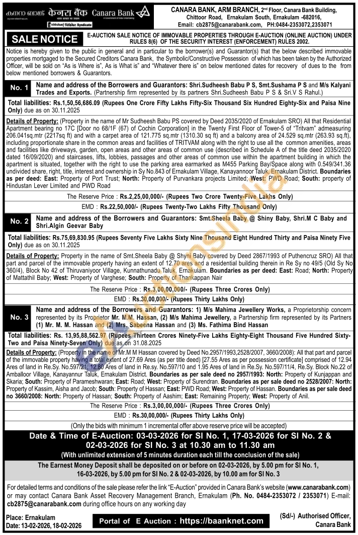 Property in the name of Smt. Sheela Baby @ Shyni Baby covered by Deed 2867/1993 of Puthencruz SRO) All that part and parcel of the immovable property having an extent of 12.70 ares and a residential building therein in Re Sy no 49/5 (Old Sy No 360/4), Block No 42 of Thiruvaniyoor Village, Kunnathunadu Taluk, Ernakulam. Boundaries as per deed: East: Road; North: Property of Mattathil Baby; West: Property of Varghese; South: Property of Thankappan Nair