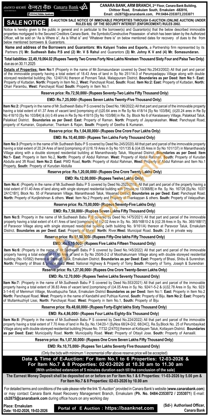 Item No:7: (Property in the name of Mr.Sudheesh Babu P S covered by Deed No.553/2021) All that part and parcel of the immovable property having a total extent of 36.83 Ares of vacant land [comprising of (i)4.05 Ares in Sy. No. 924/1-5-2 & (ii)32.78 Ares in Sy. No. 923/3-1-4-6] of Memmuri Village, Muvattupuzha Taluk, Ernakulam District Boundaries as per Deed: Item No:1: East: Property in Item No.2 North: Panchayat Road. West: Property in the name of Kandathil and Puthiya Kunnel, South: Property of Biju. Item No:2: East: Property of Mullamkuzhiyil Lissi, North: Panchayat Road. West: Property in Item No.1, South: Property of Biju