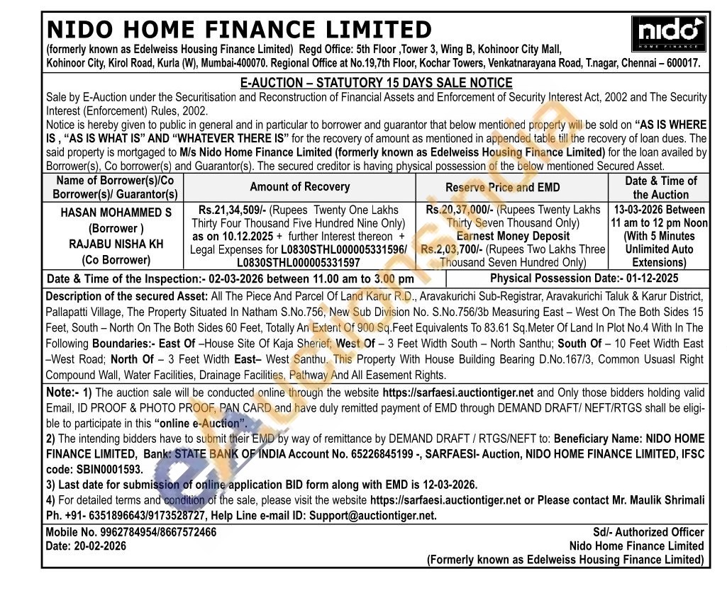 Description of the secured Asset: All The Piece And Parcel Of Land Karur R.D., Aravakurichi Sub-Registrar, Aravakurichi Taluk & Karur District, Pallapatti Village, The Property Situated In Natham S.No.756, New Sub Division No. S.No.756/3b Measuring East-West On The Both Sides 15 Feet, South-North On The Both Sides 60 Feet, Totally An Extent Of 900 Sq. Feet Equivalents To 83.61 Sq.Meter Of Land In Plot No.4 With In The Following Boundaries: East Of House Site Of Kaja Sherief; West Of - 3 Feet Width South North Santhu; South Of 10 Feet Width East -West Road; North Of 3 Feet Width East-West Santhu. This Property With House Building Bearing D.No.167/3, Common Usuasl Right Compound Wall, Water Facilities, Drainage Facilities, Pathway And All Easement Rights