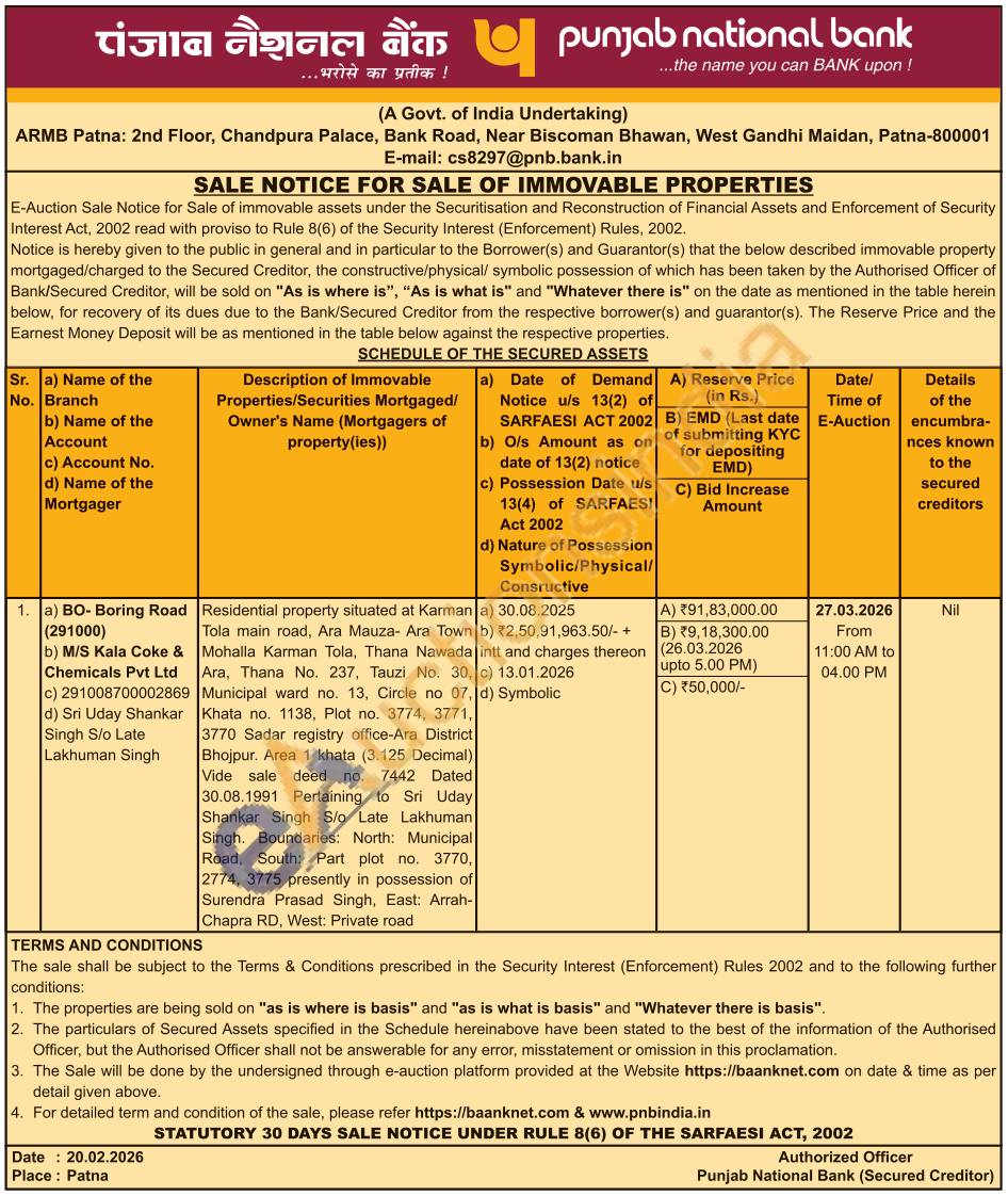 Residential property situated at Karman Tola main road, Ara Mauza- Ara Town Mohalla Karman Tola, Thana Nawada Ara, Thana No. 237. Tauzi No. 30, Municipal ward no. 13, Circle no 07, Khata no. 1138, Plot no. 3774, 3771, 3770 Sadar registry office-Ara District Bhojpur. Area 1 khata (3.125 Decimal) Vide sale deed no. 7442 Dated 30.08.1991 Pertaining to Sri Uday Shankar Singh S/o Late Lakhuman Singh. Boundaries: North: Municipal Road, South: Part plot no. 3770, 2774, 3775 presently in possession of Surendra Prasad Singh, East: Arrah-Chapra RD, West: Private road