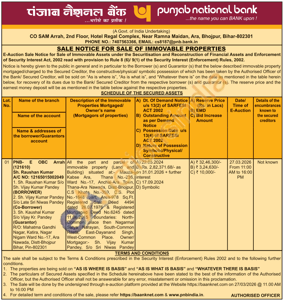 All the part and parcel of immovable property (Land and Building) situated at: Mauza-Kabse Ara, Thana No.-236, Ward No.-17, Anchal-Ara Town, Thana-Ara Nawada, Distt-Bhojpur, C.S Khata No.-359, C.S. Plot No.-1648 part, Area-978 Sq.Ft. Registered Sale Deed 4494 dated 26.07.1976 & Registered Mortgaged Deed No.6245 dated 11.06.2015 Boundaries: North-Common place then Nagarmal Satya Narayan, South-Common Rasta, East-Dayanand Singh, West-Common Place. Owner/Mortgagor:- Sh. Vijay Kumar Pandey, S/o Sri Niwas Pandey