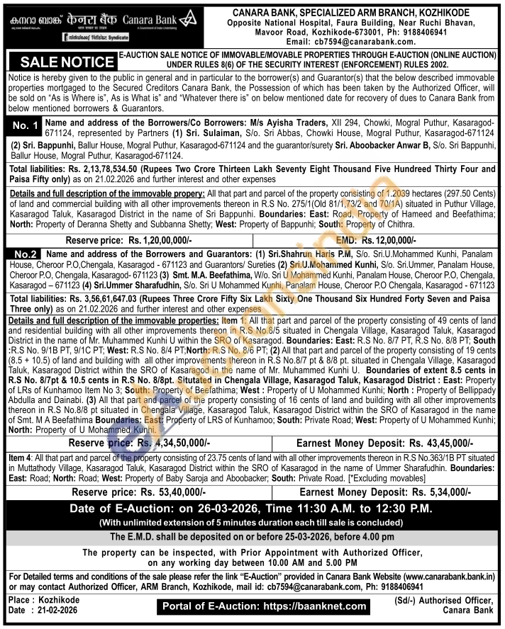 Contact Authorized Officer, ARM Branch, Kozhikode, mail id: cb7594@canarabank.com, Ph: 9188406941