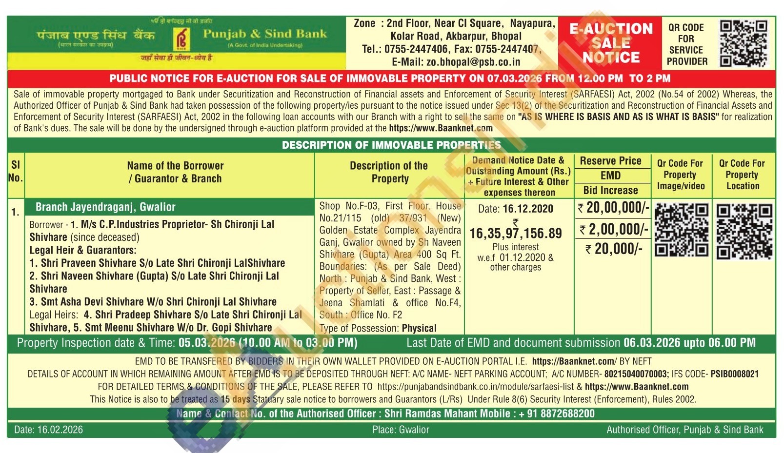 Shop No.F-03, First Floor, House Golden Estate Complex Jayendra No.21/115 (old) 37/931 (New) Ganj, Gwalior owned by Sh Naveen Shivhare (Gupta) Area 400 Sq Ft. Boundaries: (As per Sale Deed) North Punjab & Sind Bank, West: Property of Seller, East: Passage & Jeena Shamlati & office No.F4, South: Office No. F2