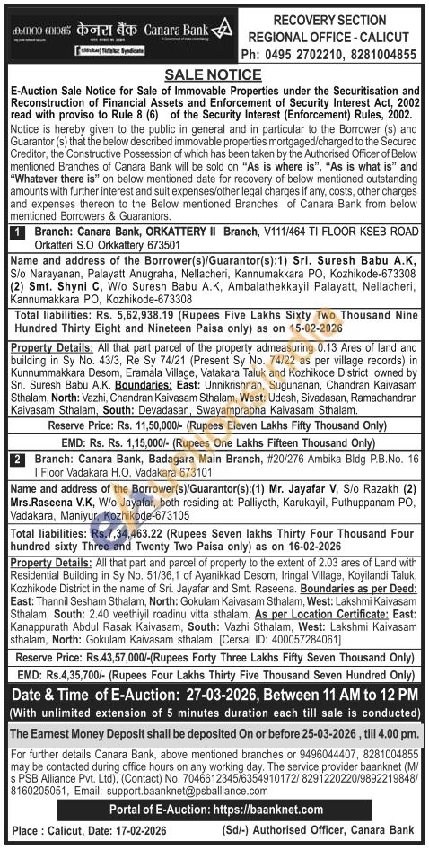 All that part parcel of the property admeasuring 0.13 Ares of land and building in Sy No. 43/3, Re Sy 74/21 (Present Sy No. 74/22 as per village records) in Kunnummakkara Desom, Eramala Village, Vatakara Taluk and Kozhikode District owned by Sri. Suresh Babu A.K. Boundaries: East: Unnikrishnan, Sugunanan, Chandran Kaivasam Sthalam, North: Vazhi, Chandran Kaivasam Sthalam, West: Udesh, Sivadasan, Ramachandran Kaivasam Sthalam, South: Devadasan, Swayamprabha Kaivasam Sthalam.