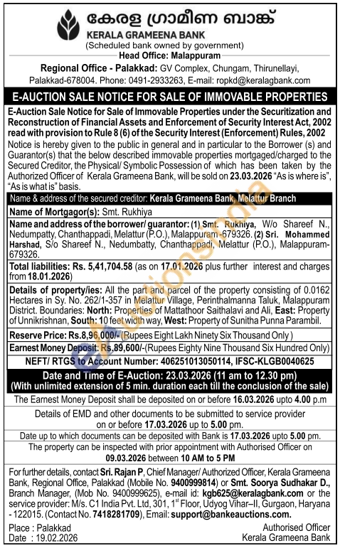Details of property/ies: All the part and parcel of the property consisting of 0.0162 Hectares in Sy. No. 262/1-357 in Melattur Village, Perinthalmanna Taluk, Malappuram District. Boundaries: North: Properties of Mattathoor Saithalavi and Ali, East: Property of Unnikrishnan, South: 10 feet width way, West: Property of Sunitha Punna Parambil