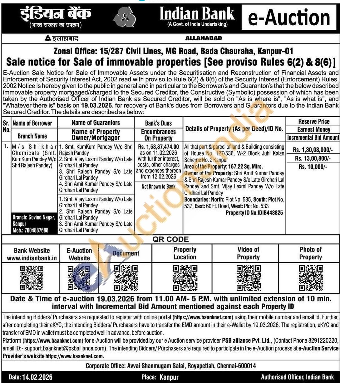 All that part & parcel of land & Building consisting of House No. 127/536, W-2 Block Juhi Kalan Scheme No. 2 Kanpur Area of the Property: 167.22 Sq. Mtrs. Owner of the Property: Shri Amit Kumar Pandey & Shri Rajesh Kumar Pandey S/o Late Girdhari Lal Pandey and Smt. Vijay Laxmi Pandey W/o Late Girdhari Lal Pandey Boundaries: North: Plot No. 535, South: Plot No. 537, East: 60 Ft. Road, West: Plot No. 533 Property ID No.IDIB448825