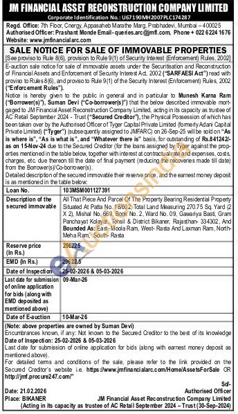All That Piece And Parcel Of The Property Bearing Residential Property Situated At Patta No. 18/602, Total Land Measuring 270.75 Sq. Yard (2) X 2), Mishal No. 669, Book No. 2, Ward No. 09, Gawariya Basti, Gram Panchayat Kolayat. Tehsil & District Bikaner, Rajasthan- 334302, And Bounded As: East-Moola Ram, West- Rasta And Laxman Ram, North-Meha Ram, South Rasta