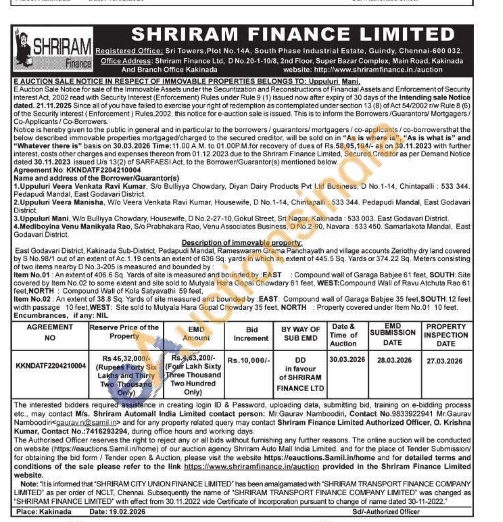 East Godavari District, Kakinada Sub-District, Pedapudi Mandal, Rameswaram Grama Panchayath and village accounts Zeriothy dry land covered by S No.98/1 out of an extent of Ac. 1.19 cents an extent of 636 Sq. yards in which an extent of 445.5 Sq. Yards or 374.22 Sq. Meters consisting of two items nearby D No.3-205 is measured and bounded by: Item No.01: An extent of 406.6 Sq. Yards of site is measured and bounded by: EAST Compound wall of Garaga Babjee 61 feet, SOUTH: Site covered by Item No.02 to some extent and site sold to Mutyala Hara Gopal Chowdary 61 feet, WEST:Compound Wall of Ravu Atchuta Rao 61 feet, NORTH: Compound Wall of Kola Satyavathi 59 feet, Item No.02: An extent of 38.8 Sq. Yards of site measured and bounded by: EAST: Compound wall of Garaga Babjee 35 feet, SOUTH: 12 feet width passage 10 feet, WEST: Site sold to Mutyala Hara Gopal Chowdary 35 feet, NORTH Property covered under Item No.01 10 feet